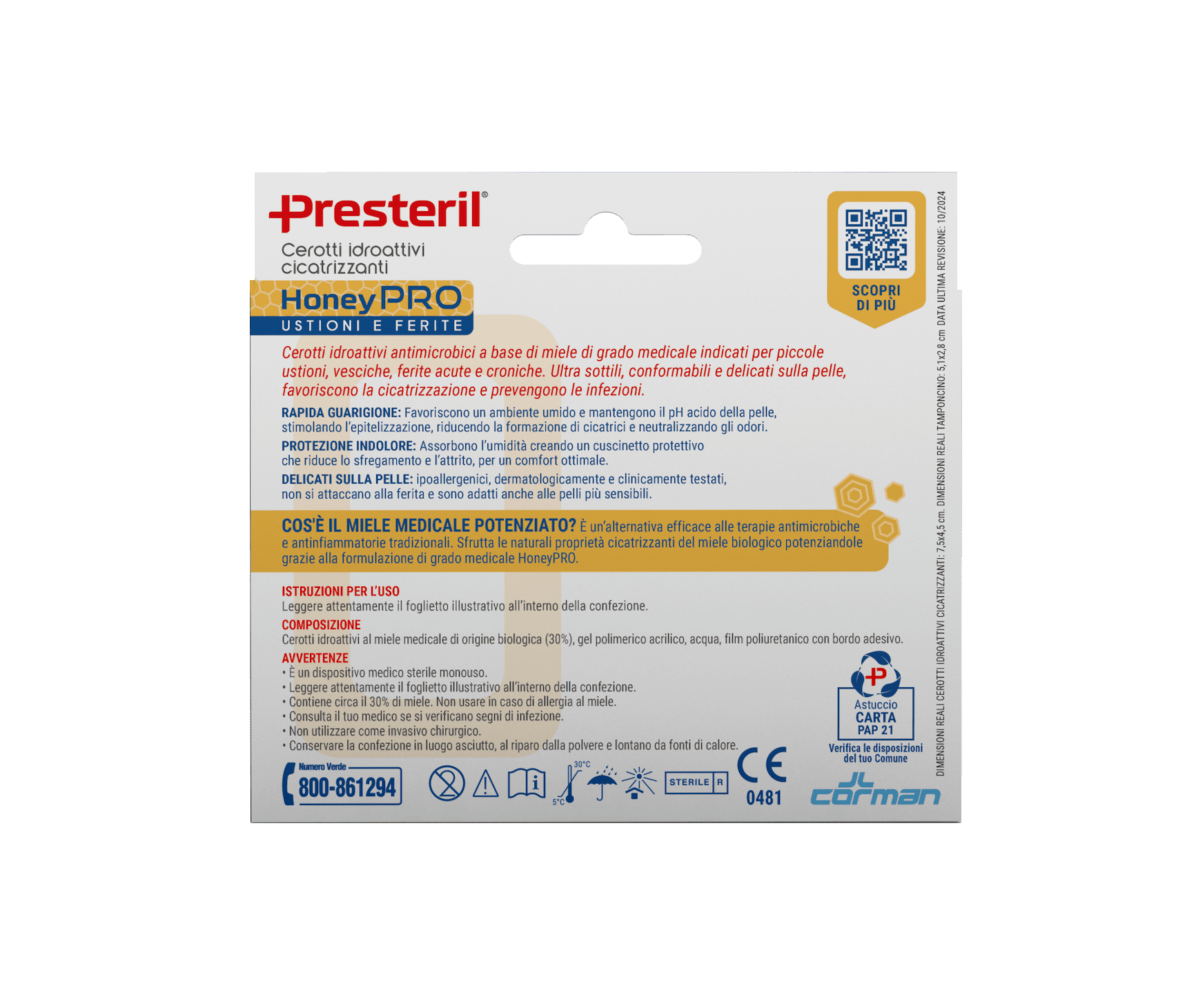I cerotti idroattivi cicatrizzanti e antimicrobici HoneyPRO sono a base di miele di grado medicale e indicati per piccole ustioni, vesciche, ferite acute e croniche.