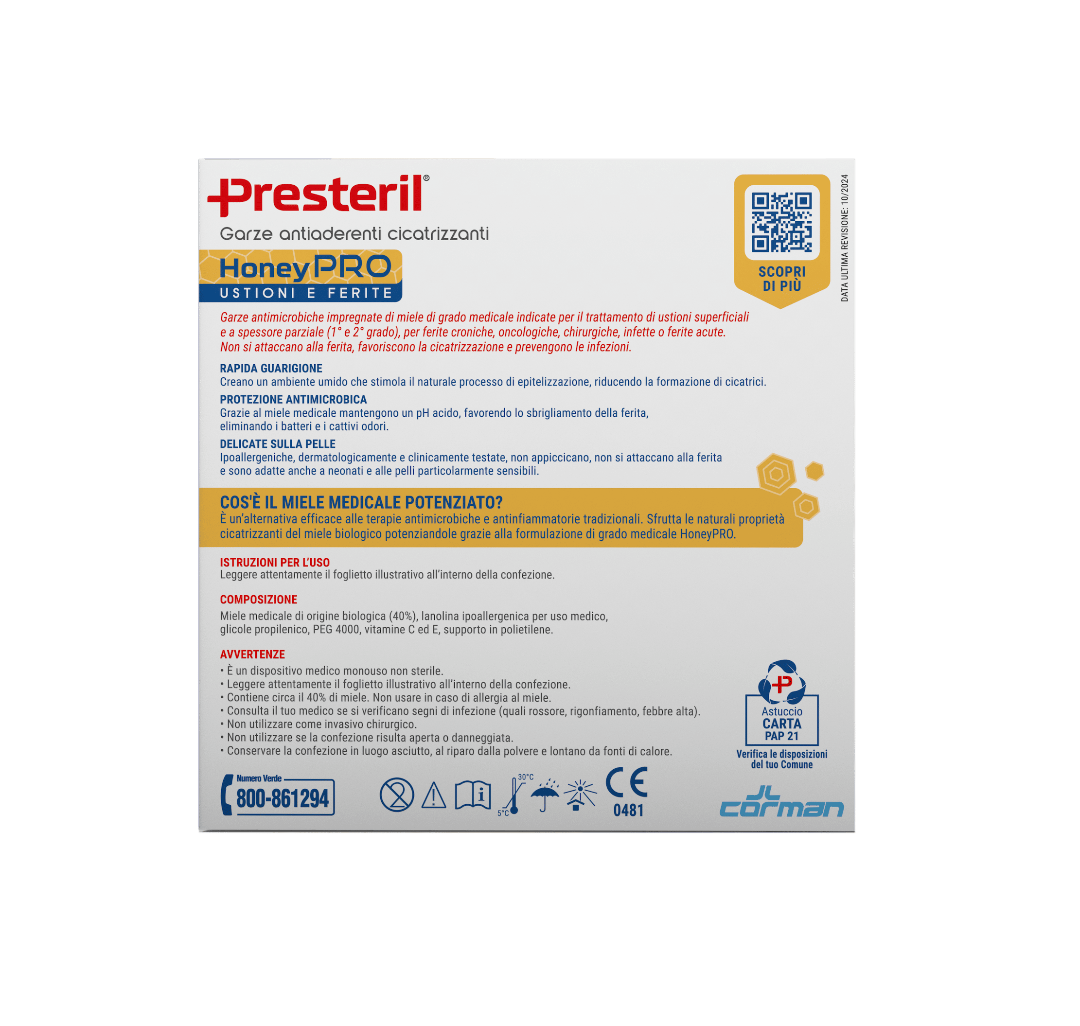 Le garze antiaderenti, cicatrizzanti e antimicrobiche HoneyPRO sono impregnate di miele di grado medicale e arricchite con vitamina C ed E.